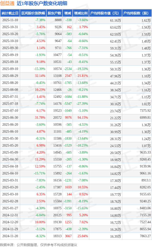 从股价来看,2025年10月31日至2025年11月10日,创益通区间跌幅为7.38%,在此期间股东户数减少338.0户,减幅为3.66%。