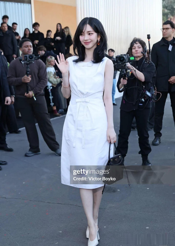 柳智敏披肩中长发,身穿白色无袖长裙,拎着黑色的包包。脚上穿了一双驴蹄鞋,虽然鞋子有点丑,但整体搭配的还是蛮好看的。她挥了挥手个大家打招呼笑容甜美,完全是小公主来的。
