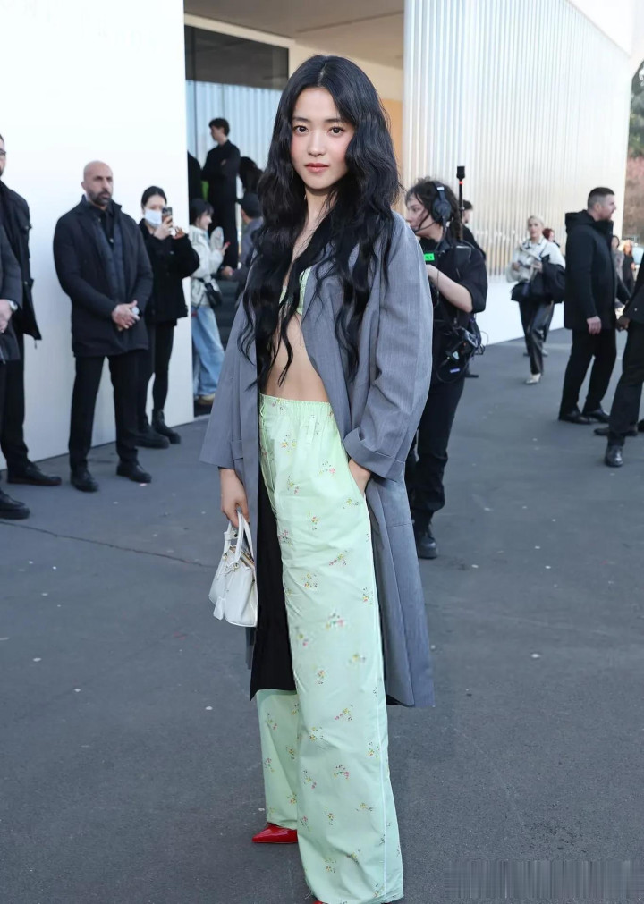 相对于杨幂和柳智敏的穿搭,金泰梨的这一身穿搭可以说是非常的混搭加让人看不懂。灰色的长款外套,里面是绿色的比基尼上衣,搭配同色系裤子,衣服的材质和颜色看着就像睡衣似的。没什么质感。而且脚上还穿了一双红色的高跟鞋。还好她颜值气质在线,才没有翻车。