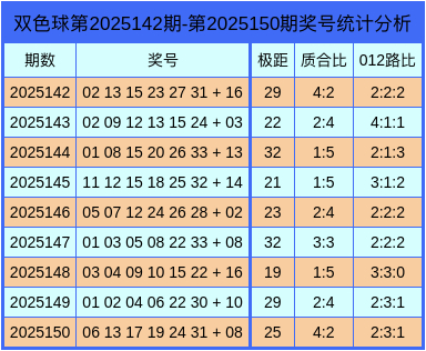 上期回顾:双色球第2025150期回顾:红球06、13、17、19、24、31 + 蓝球08。