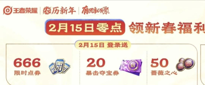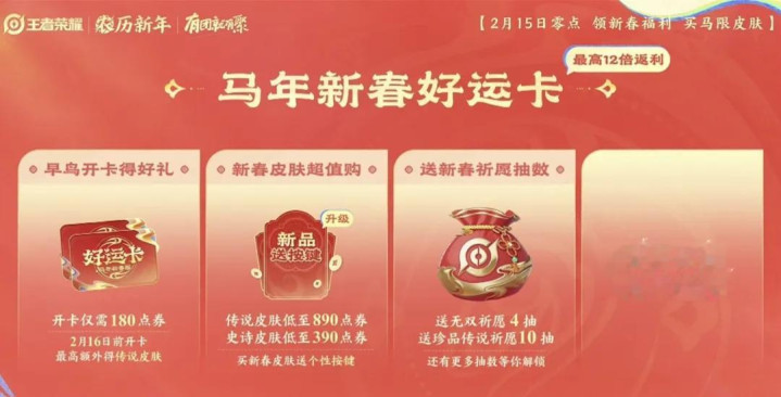 荣耀典藏在春节当中没怎么缺席过,但今年1月刚出了吕布,不知道还有没有机会见证新典藏诞生了。不过,春节是已经确定会送暴击夺宝*20抽,届时我们可以试试水。